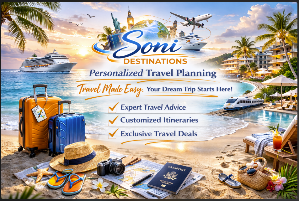 Secure your dream vacation today with Soni Destinations! Our travel expert is ready to tailor a seamless itinerary that suits your preferences and schedule.
